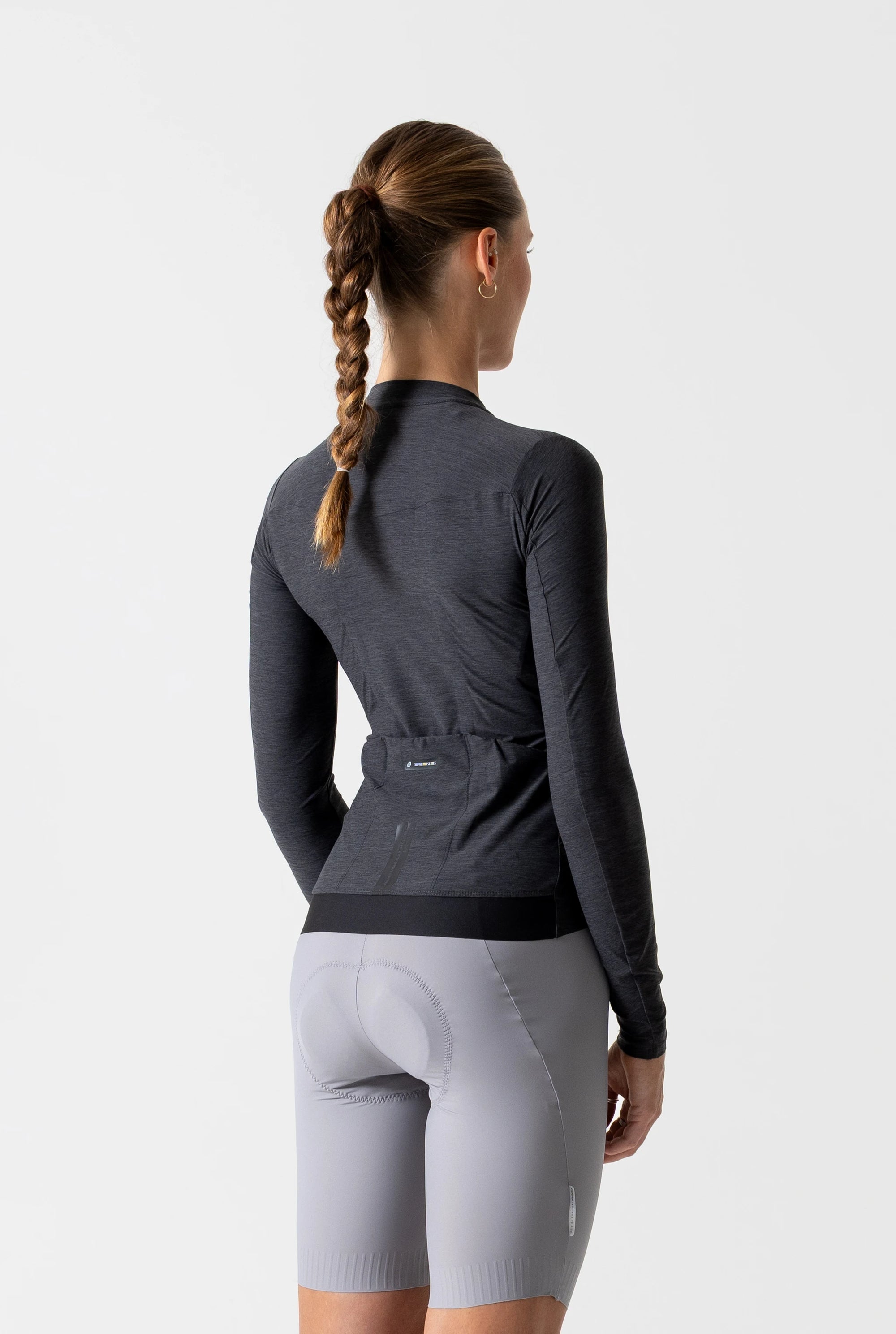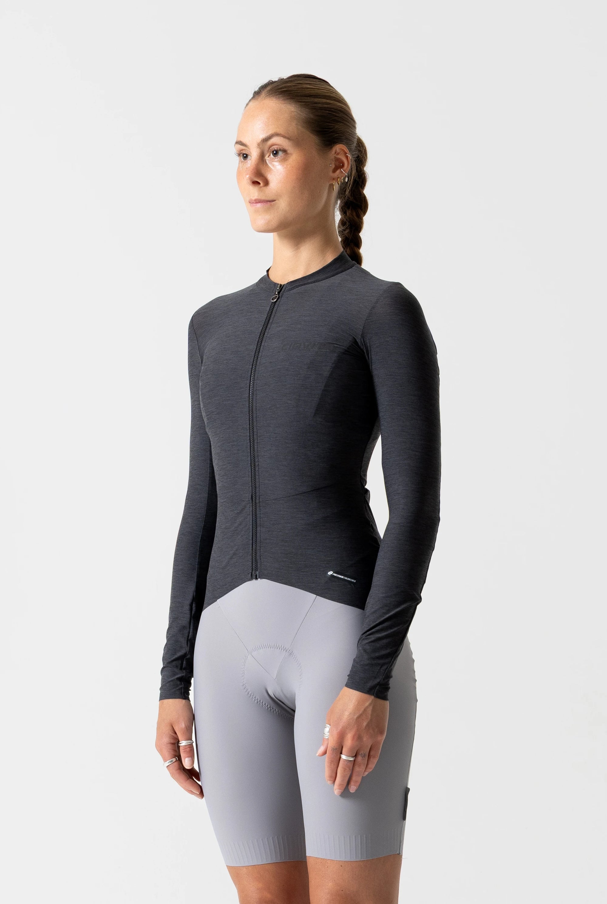 A woman wearing a charcoal cycling jacket with full length YKK zipper, designed for gravel road riding. The jacket features a windproof fabric, under helmet hood, reflective trims, and an elasticated hem.