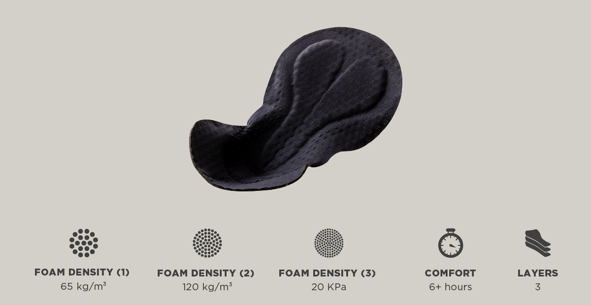 We have worked with our European suppliers in creating a new 4-layer Chamois pad for the Supremo Bib. The outer layers feature comfortable, but durable fabrics which provide moisture and odour control as well as a softer feel. These outer layers have been designed that when they are stitched into the bib they help create the ergonomic shape of the inner pads. The inner layers consist of two distinct types of high tech foam, the very light, highly breathable VitaFoam, which absorbs heavy shocks and compression; and the complementary perforated foam, which cushions against lighter vibration and bumps. Working together each layer delivers something different, but ultimately works to create our most comfortable chamois ever.
